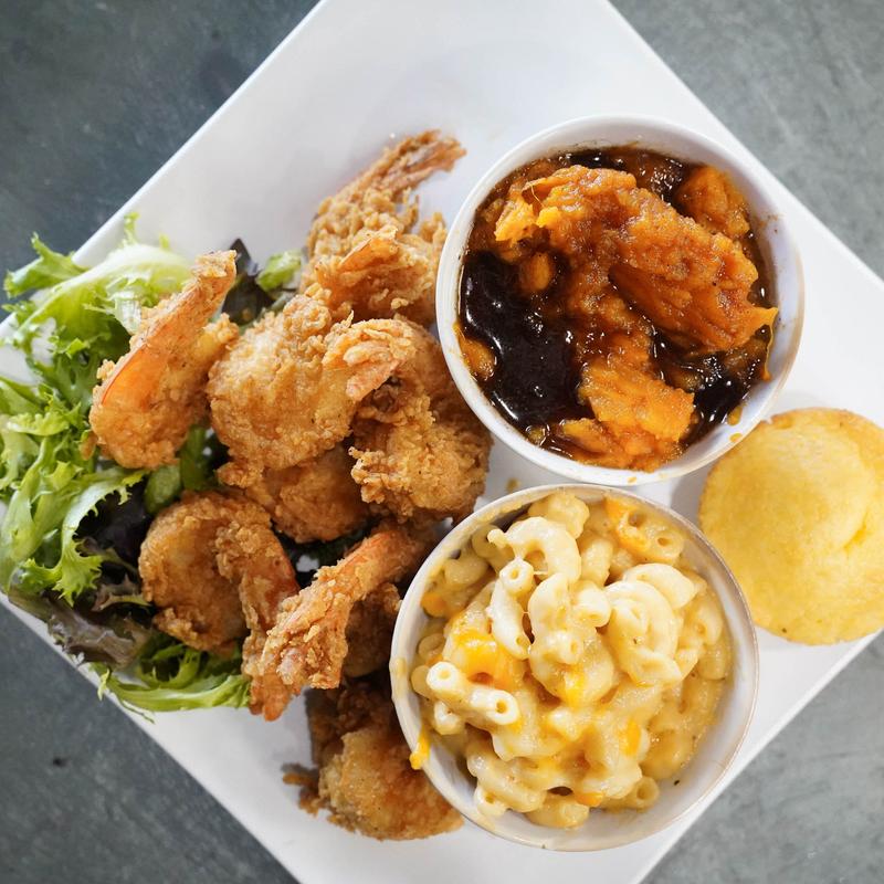 ½ lb. of our large jumbo shrimp, lightly breaded and flash-fried or grilled, served with your choice of two sides and cornbread.