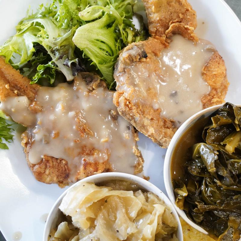 This southern classic is a house favorite. We lightly bread our bone-in pork chops or turkey chops, fried to a golden brown or grilled, then finished in our house-made gravy, served with your choice of two sides and cornbread.