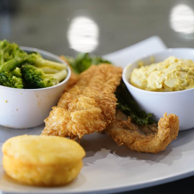 Wild-caught local Catfish or Whiting, lightly breaded and southern fried or grilled, served with your choice of two sides and our house cornbread.