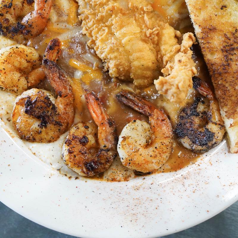 Choice of catfish or whiting over Southern-style grits topped with Cajun gravy, shredded Cheddar Jack cheese, and bacon bits served with a side of toast.